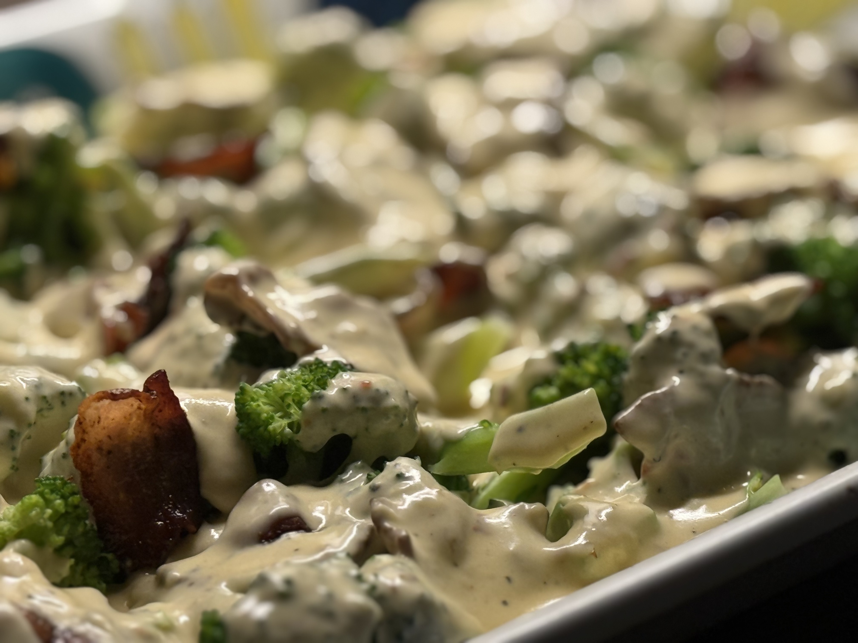 Lägg broccolin i en ugnsform. Strö över baconet och häll såsen över. Toppa eventuellt med lite extra ost och bacon.