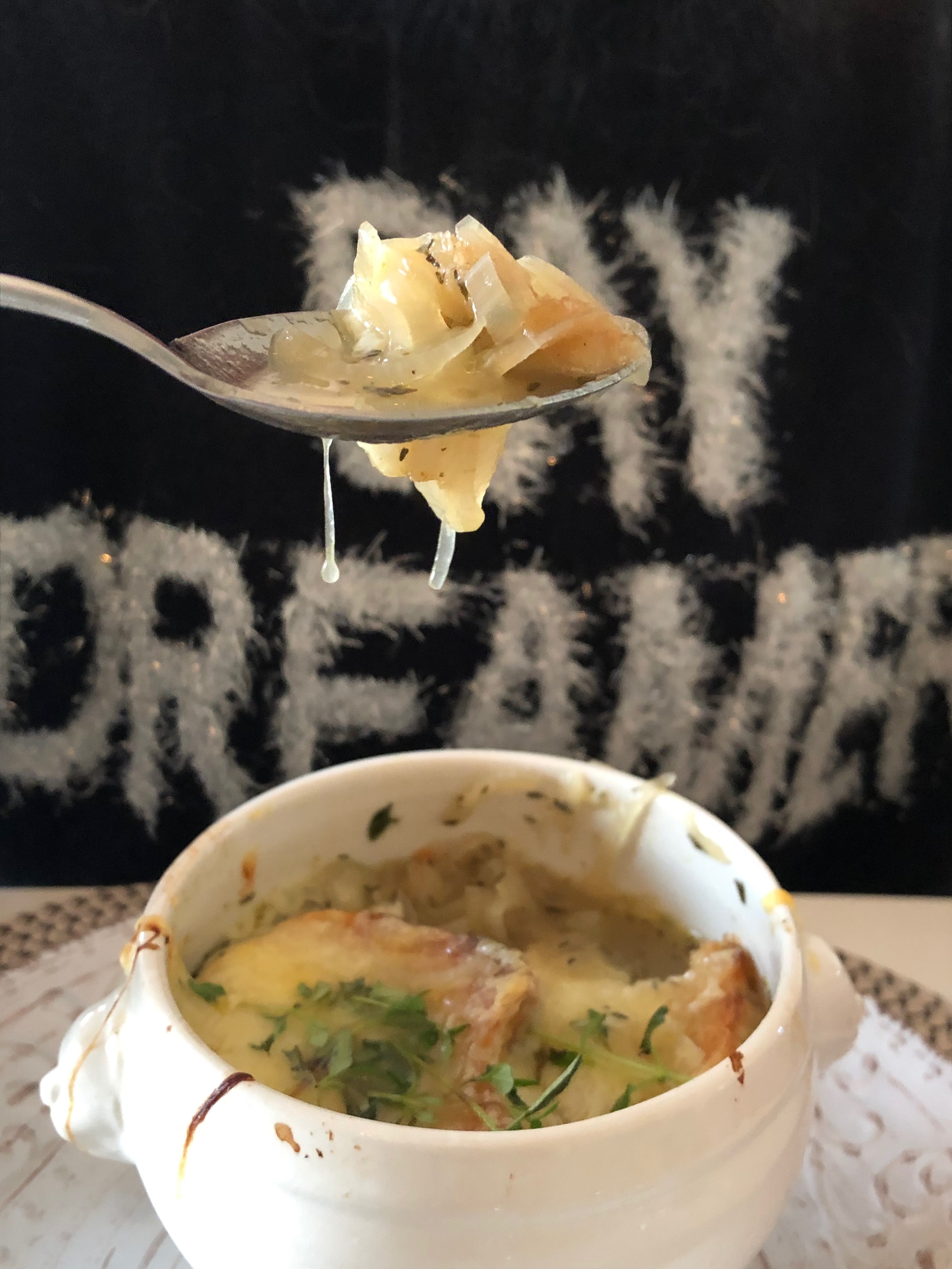Riv osten och rosta brödskivorna. Häll upp soppan i skålar, lägg de rostade brödskivorna på toppen av soppan och strö över rikligt (ja rikligt) med riven ost. Gratinera i ugn på 275 grader i ca 5 minuter eller tills osten ser färdig ut. Garnera med ett par kvistar timjan. Klart att servera!